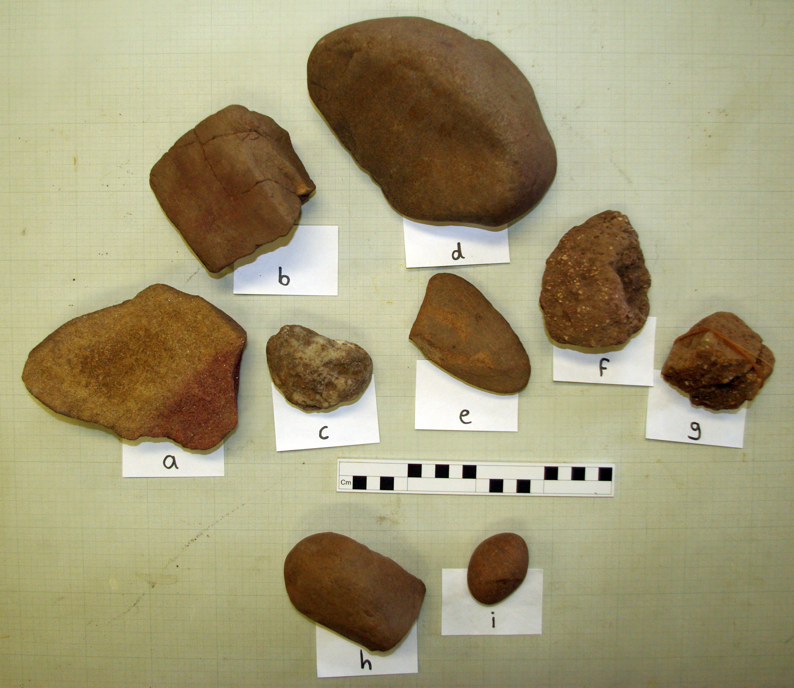 Features included a modest post hole with adjacent “slot” or scoop (not dissimilar to one found in Penny Spikin’s March Hill excavations in the central Pennines). It’s not inconceivable that it’s Mesolithic. There was a test pit, just behind the crest of the ridge, that produced an area of stones and cobbles, and an elliptical lens of charcoal around 20cm in diameter and 3-4cm deep. It seemed to be surrounded by some of the cobbles and there was a flint blade or two and some spalls between the stones. The stones themselves were odd in that they were different to the natural eroded sandstone and not native to the area. While glacial tills (boulder clay) do exist on the coastal margins south of Whitby (their likely source) they are unusual at this elevation and must have been brought to (or at least arranged at) this spot intentionally. Some stones were heavily burnt—or indeed half burnt (stone ‘a’ in the picture) with a clear line showing where the heat had affected only one side—and one metamorphic piece displayed linear “lattice” groove marks. Whilst these could be due to historical plough or agricultural damage, none of the other stones were similarly affected. All will be submitted to a geological specialist for examination.
