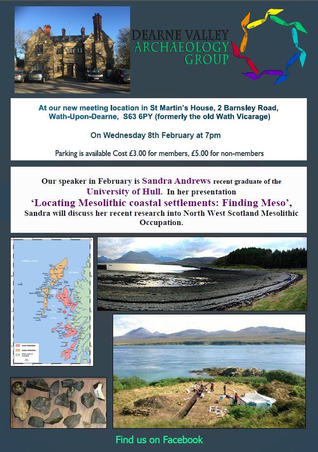 Lecture | Dearne Valley Archaeology Group: Mesolithic NW Scotland 8-Feb-2017 Posted on 28 January, 2017 by Spencer Carter Locating Mesolithic Coastal Settlements: Finding Meso North-west Scotland Mesolithic occupation by Sandra Andrews Wath Upon Dearne S63 6PY Share this: Click to share on X (Opens in new window) X Click to share on Facebook (Opens in new window) Facebook Like Loading... Related