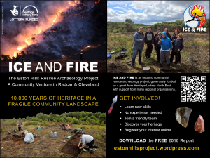 Speaking of ice, and fire as the arson season commences on Teesside, there’s been a great deal of progress with the ICE AND FIRE rescue archaeology project in the Eston Hills, Redcar & Cleveland, North Yorkshire. The 2017 season finds have been catalogued and some enigmatic, unusual artefacts will undergo further scientific research. The HLF-funded project in 2017, its first full season of geophysical surveys, test-pit excavations and pollen-coring, has exceeded all expectations.