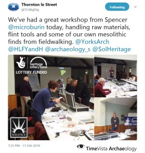 Earlier in the year Microburin was delighted to attend the Thornton-le-Street Roads To The Past kickoff weekend in North Yorkshire, hosted by friends at Solstice Heritage LLP, to examine their lithics finds and provide an introduction to prehistoric lithics workshop – with the luxury of home-made cakes. What’s remarkable is that on day one of their field-walking they recovered a fantastic flint-and-chert assemblage that takes us back to the Mesolithic, as well as later periods. In May I’ll be returning to deliver two more workshops to enable the community group to be self-sufficient in first level recording and identification of their finds. There assuredly is much more to come in those river-side fields! The hint is always in wetlands.