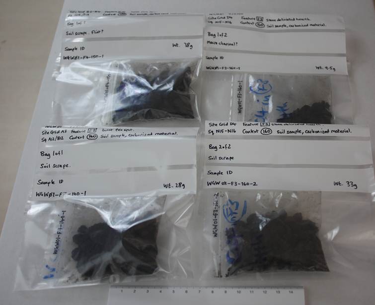 Image_WhiteGill_samplesEach of the fire-spots was sampled even though it was virtually impossible to recover any chunks of charcoal. You take a soil scrape from the burnt context in lieu of digging up the whole thing and micro-excavating it in a lab, as they did in the West Yorkshire project (Penny Spikins). The charcoal is so fragile that it fell apart if you tried, and I did try. Labeled-up and triple-sealed in ziplock bags, they sat in boxes until Spring this year, holding back their secrets. As part of this voluntary project, lithics without context are just broken stones. Lithics in undated contexts are interesting broken stones that begin to tell a story—provide a through-the-keyhole view of activities at a moment in time sometime a long time ago. Ah, time? Could the charcoal not only fix the human activities in calendar time, but also say something about the immediate environment, perhaps even the selection of wood and tinder, when the only other artefact survivals are the broken stones?