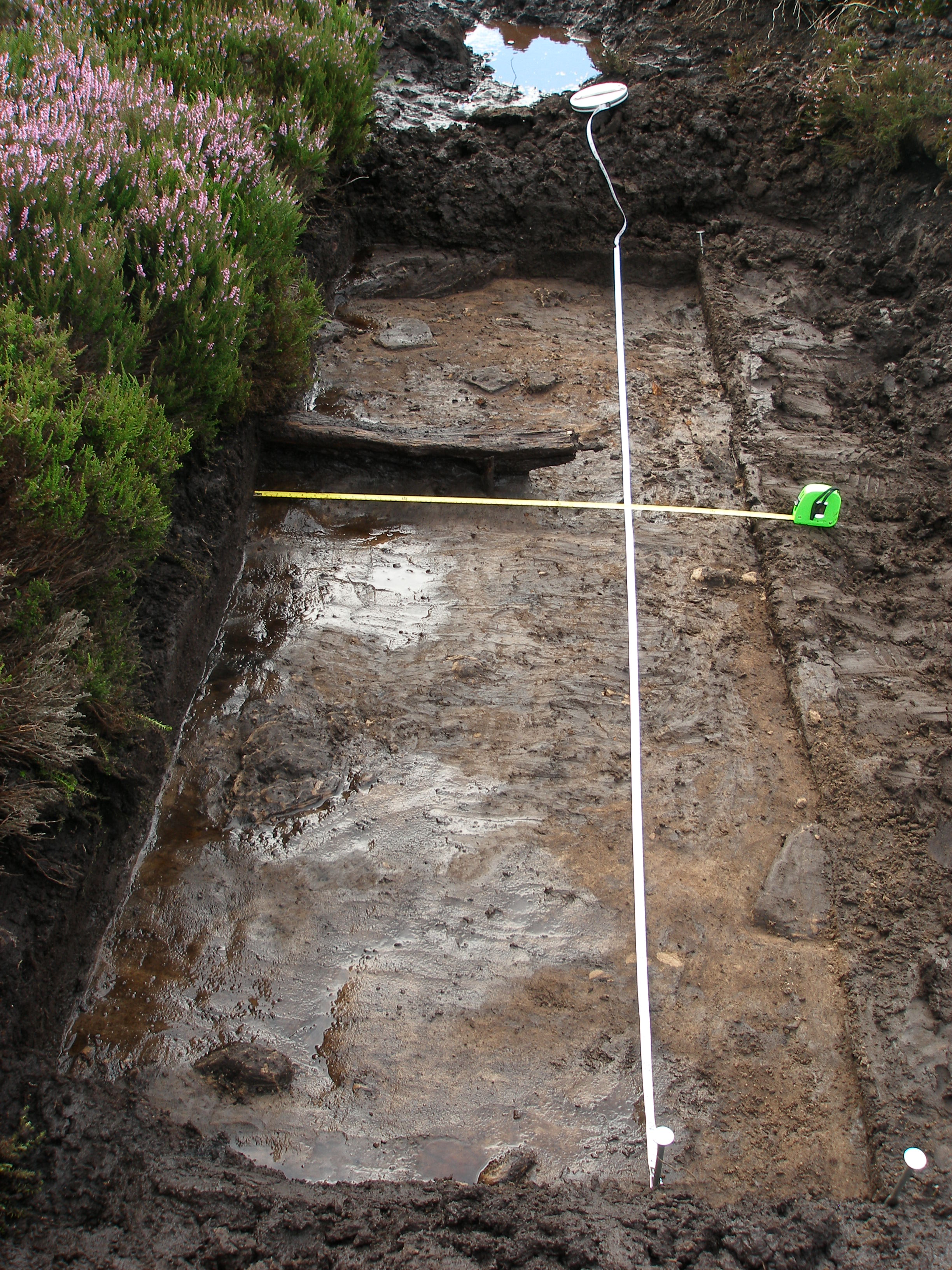 I returned to the site the a few days later to re-clean about 3 square metres of the section and explore a timber fragment protruding from the peat with some vertical birch stems sitting to the side. Over the entire day, thankfully a dry one, the area was cleaned up, planned and photographed. The vertical “stakes” proved to have nice little root systems and so, with the clay laying around, seem to have been growing in a damp hollow—one could see the tiny sections of reeds as black flecks in the clay.