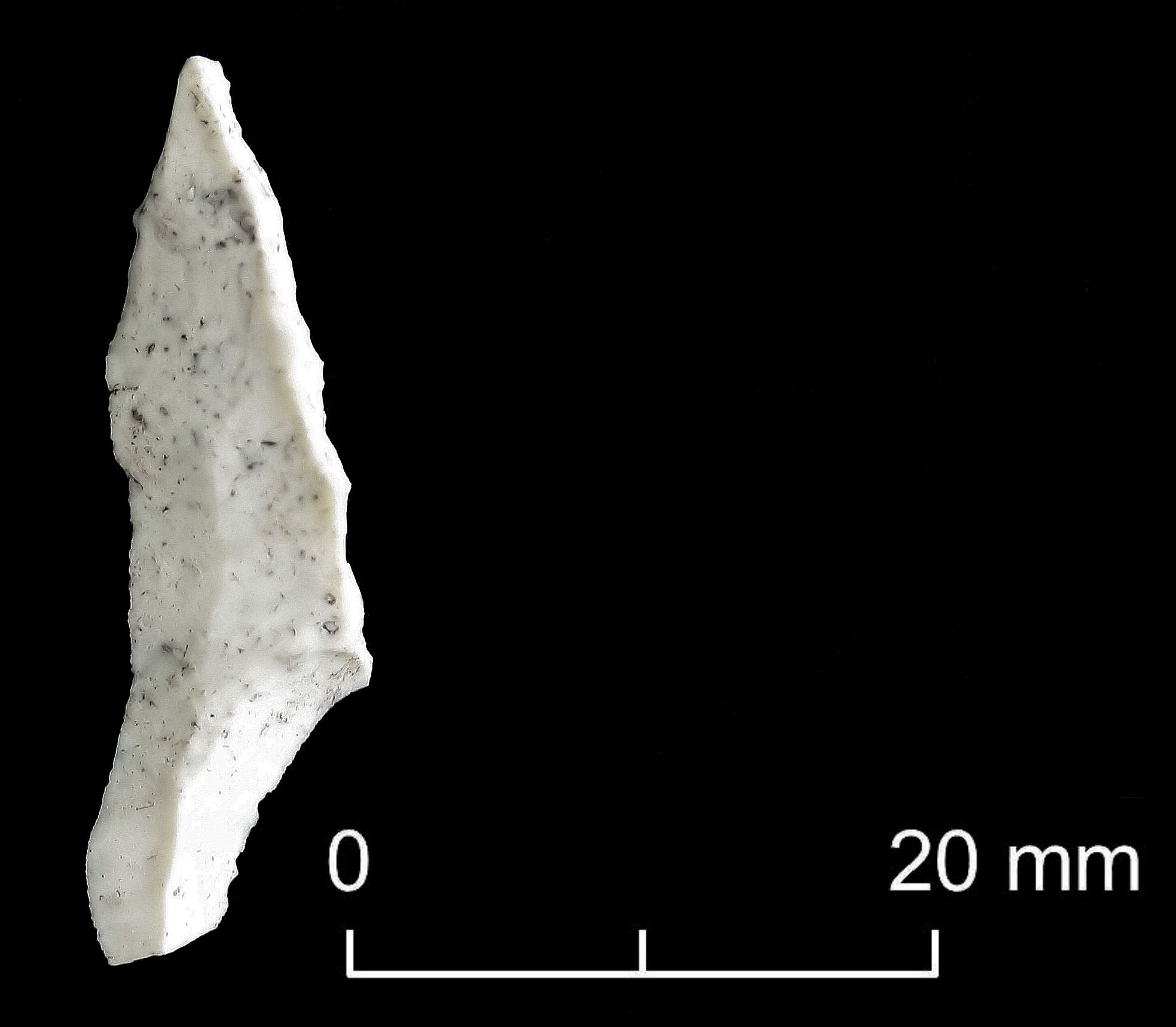 Microlith_EMDC_TeesEarly Mesolithic flint projectile point, Deepcar type, c. 8500 BC (a little later than Star Carr) from Eston Hills, Teesside. White flint has sources in East Yorkshire and Lincolnshire, many tens of kilometres away. These rare but characteristic tools are found along river valleys.