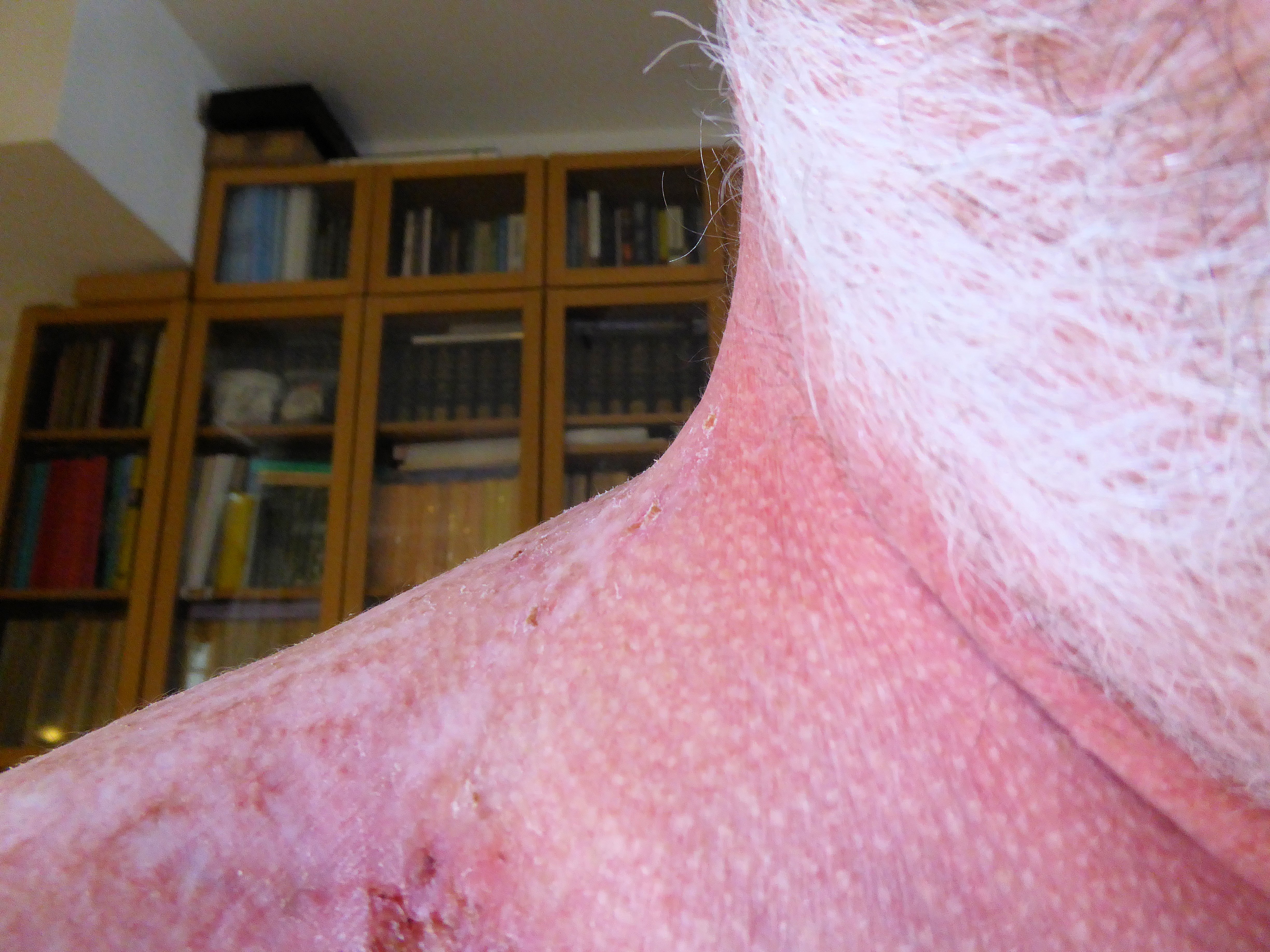 In month 17 of LongCovid, earlier images below this set. Minor lesion at base of back, L leg/shin still presents “covid” type rashes along with psoriasis, minor but bleed profusely. R arm aches (like over exercise). R-arm lesions bleed profusely when scabs/plaques peel off, needle-stabbing pain and intense itching, always white waxy pustules or dysfunctional follicles: when present, nothing heals. Hand and wrist much improved but remain volatile and re-erupt.