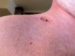 Dark red circle, waistline, rear L hip, developed from bump through 2025, swelled to c 3cm diam 3-4mm raised Mar-Apr, itchy-sting-bruise, slightly sticky in centre with flaking. Burst July with spurting blood (lots), no puss or odour. Slowly calming since, until commencing Amoxicillin 02-Sep – has become slightly aggravated.