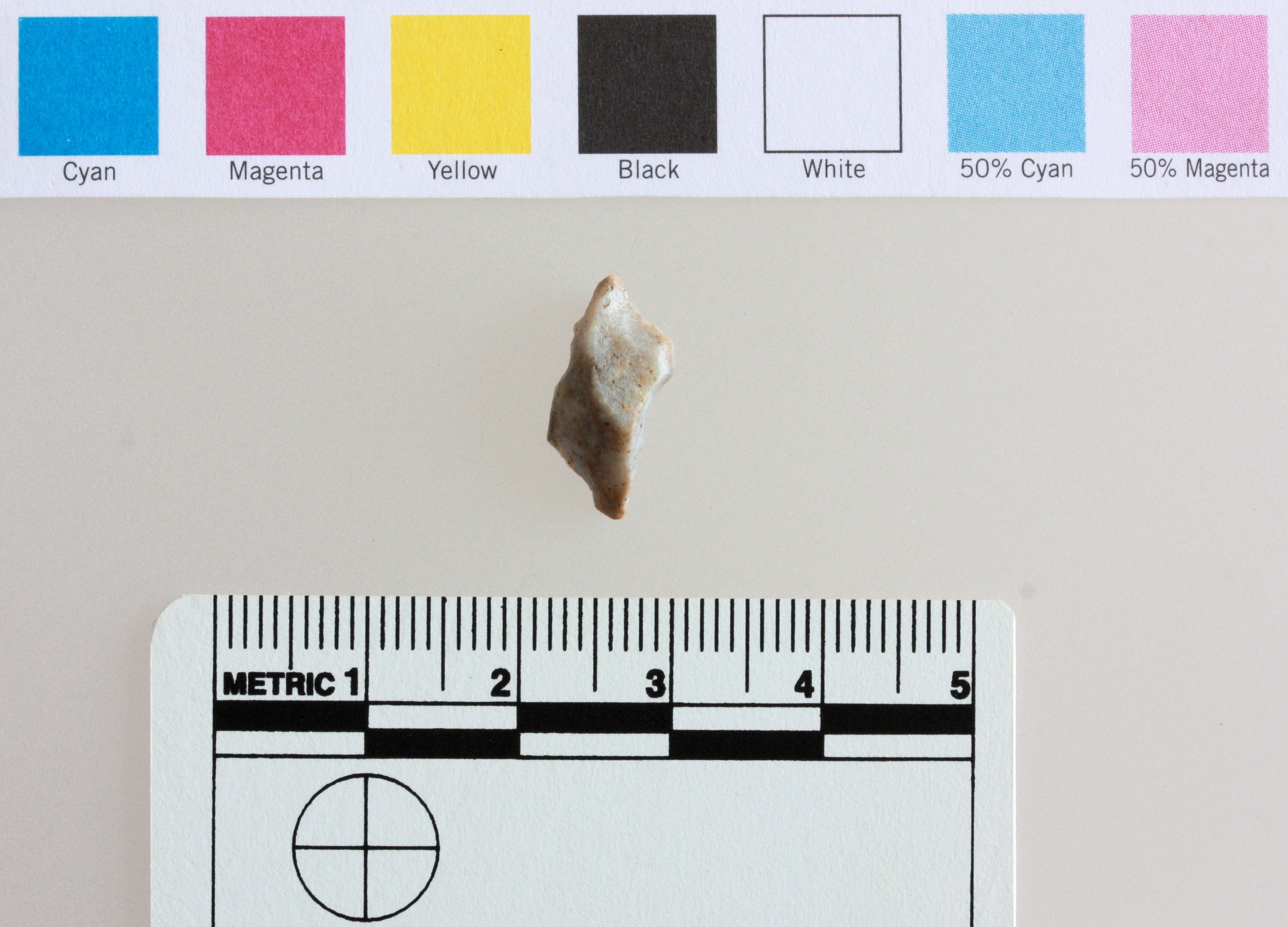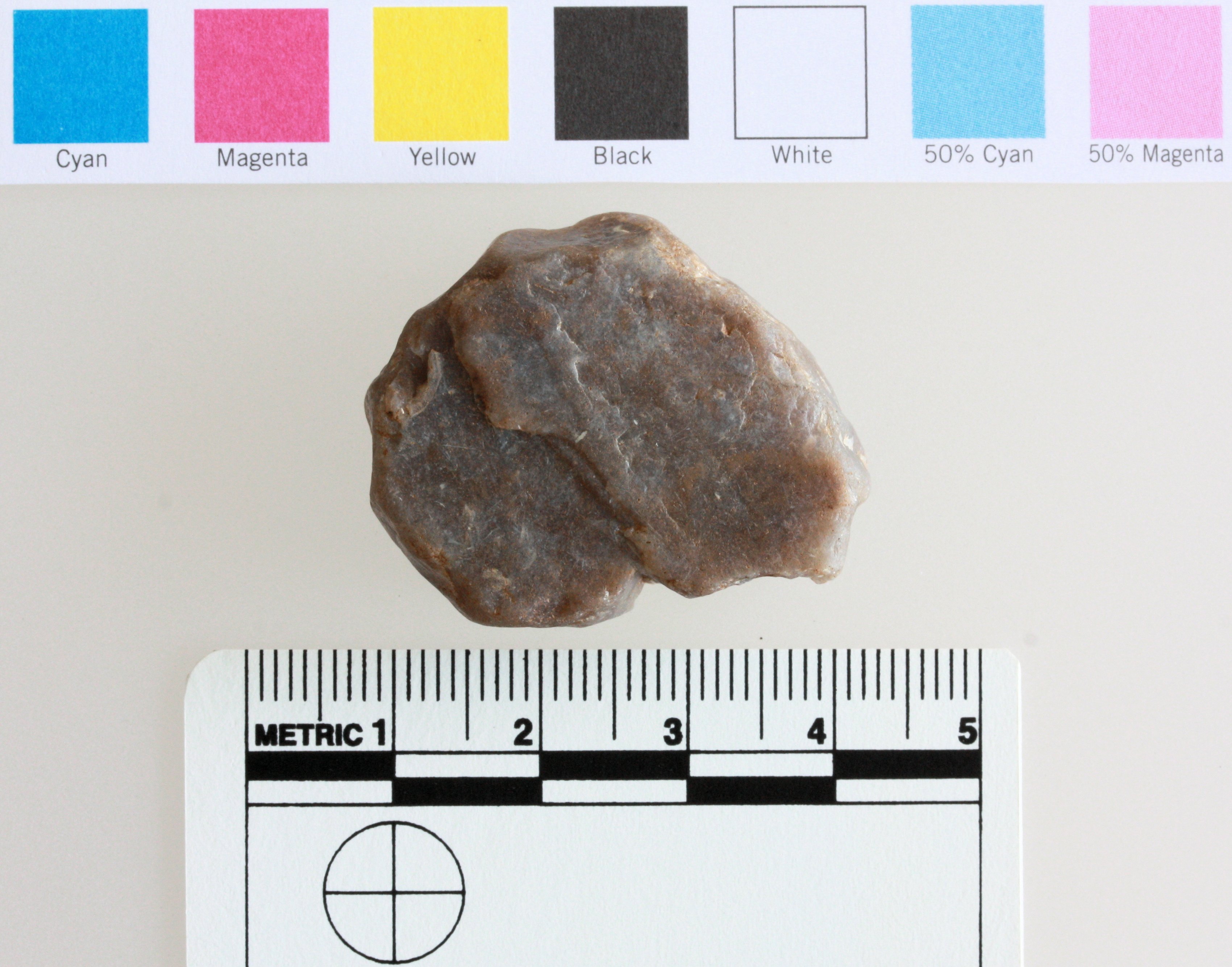 Lithic21sideWhat I now find is far more efficient and consistent is using an acrylic frosted block, the type you see in museums or retail displays. In diffused natural daylight the block lets sufficient light permeate around the base of an artefact to suppress excessive shadows – the object almost seems to float in a milky ether – and allows for a small enough aperture (high f/stop number) to counter blurring within the frame, or between the top of an object and the scale, such as with deep objects like cores, items with heavy curvature or a deep arête. Lighting can be tuned by raising the block on a clear acrylic stand or placing foil or white card underneath – much cheaper than using a lightbox (not very transportable) or augmenting with artificial lighting. By using a good quality photographic scale I’ve also avoided the need to overlay digital scale images, although this is easy enough to do. And if an object needs support, I actually find that soft silicone earplugs (like bluetack but colourless) work fine.