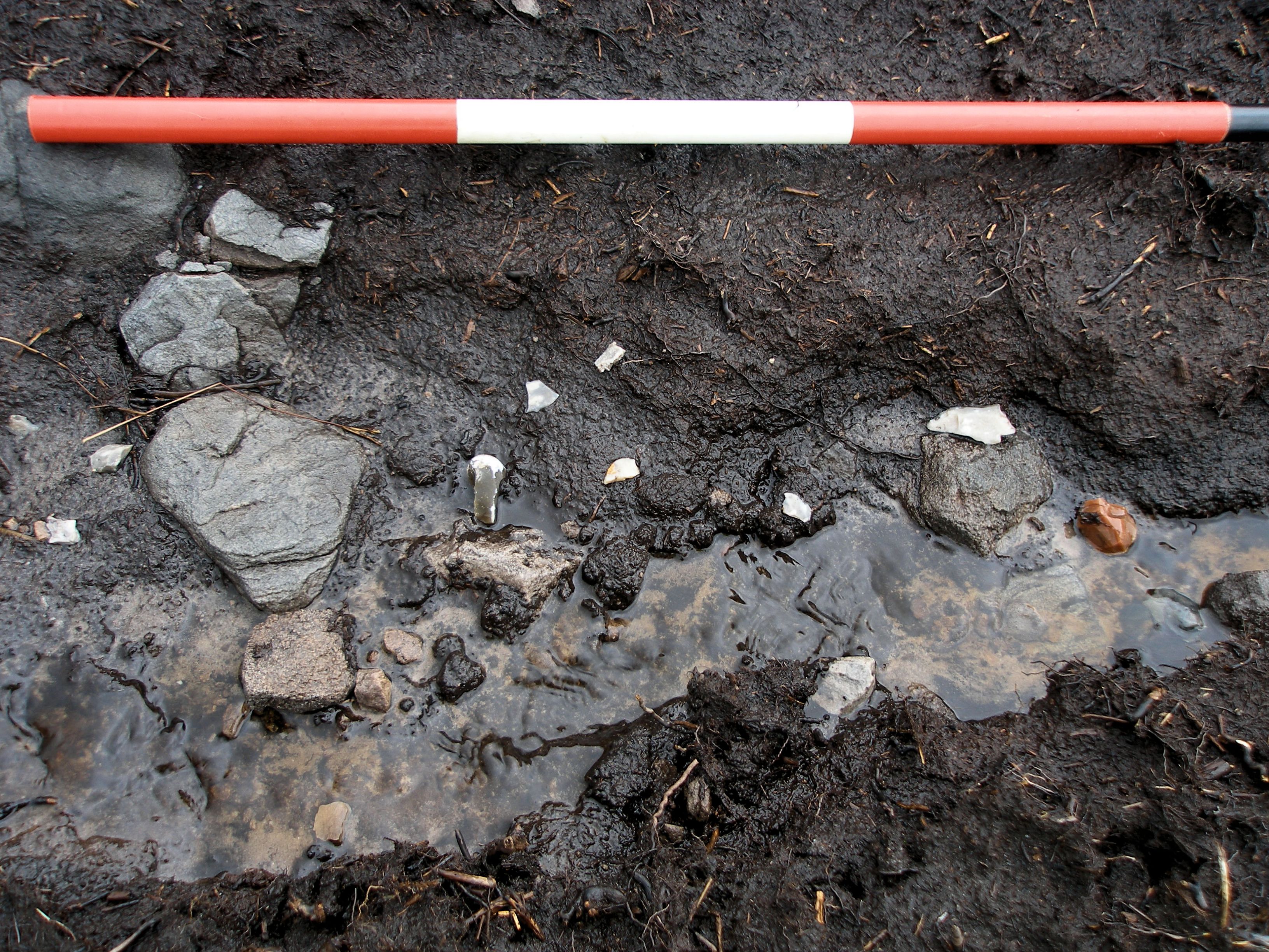 We chose one of the slightly easier structures, effectively a huge pile of rubble with a tantalising likely 17th-century window in the north wall remnant, and an area of the attached garden plot where artefacts lay immediately below the turf and through about 0.4m of wonderful garden soil. Fragments of the iron oven lay scattered amongst the rubble although a large proportion of the cooking range was subsequently recorded in situ. We did manage to uncover one of the domestic rooms — the kitchen and entrance passageway — and a cobbled-and-flagged byre with a scythe sticking out of the section.